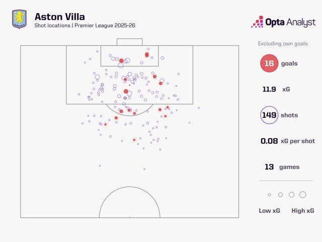 维拉本赛季射门位置分布,红点为进球,7个是禁区内,9个是禁区外。