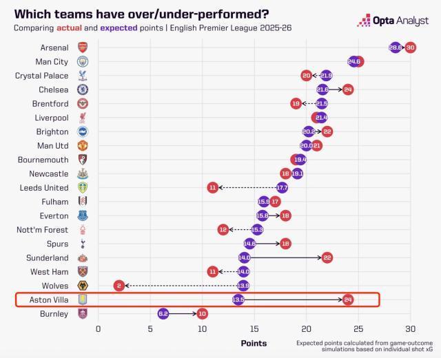 维拉是本赛季英超最“离谱”的球队,预期13.5分实际拿到24分,反面则是狼队,同样预期13.5分,实际只有2分。