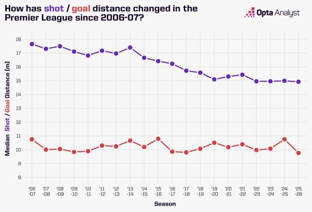 近十几年,英超的平均射门(紫)和进球(红)距离总体走低。