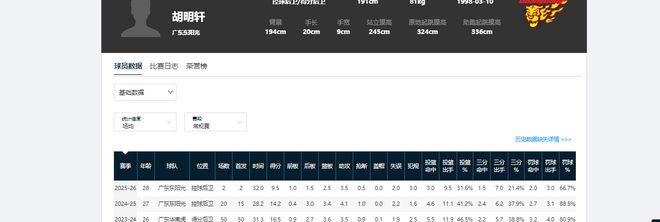 第二位:广东男篮胡明轩上赛季,胡明轩场均可为球队贡献14.2分3.4篮板4.1助攻,投篮命中率41.2%,三分命中率37.9%。本赛季2场过后,他的投篮命中率仅为31.6%,三分命中率更是低至21.4%。
